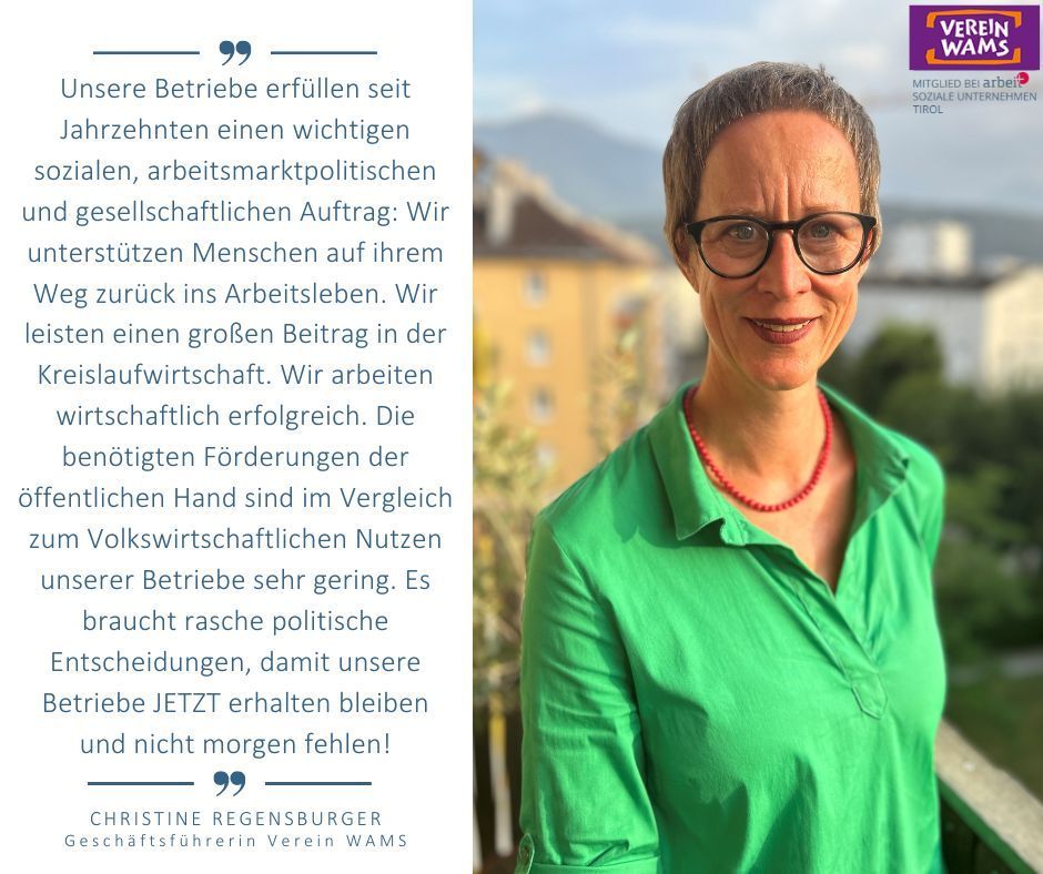 „Unsere Betriebe erfüllen seit Jahrzehnten einen wichtigen sozialen, arbeitsmarktpolitischen und gesellschaftlichen Auftrag: Wir unterstützen Menschen auf ihrem Weg zurück ins Arbeitsleben. Wir leisten einen großen Beitrag in der Kreislaufwirtschaft. Wir arbeiten wirtschaftlich erfolgreich. Die benötigten Förderungen der öffentlichen Hand sind im Vergleich zum Volkswirtschaftlichen Nutzen unserer Betriebe sehr gering. Es braucht rasche politische Entscheidungen, damit unsere Betriebe JETZT erhalten bleiben und nicht morgen fehlen!“ – so Christine Regensburger, Geschäftsführerin Verein WAMS