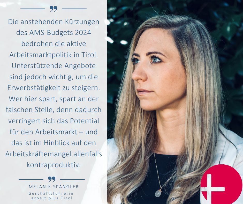 „Die sozialen Unternehmen von arbeit plus – Soziale Unternehmen Tirol, verfügen über die entsprechende Erfahrung und wissen, was es braucht, damit Langzeitarbeitslose Menschen (wieder) arbeiten können. Die anstehenden Kürzungen des AMS-Budgets 2024 bedrohen die aktive Arbeitsmarktpolitik in Tirol. Unterstützende Angebote sind jedoch wichtig, um die Erwerbstätigkeit zu steigern. Wer hier spart, spart an der falschen Stelle, denn dadurch verringert sich das Potential für den Arbeitsmarkt – und das ist im Hinblick auf den Arbeitskräftemangel allenfalls kontraproduktiv.“-so Melanie Spangler, Geschäftsführerin von arbeit plus Tirol