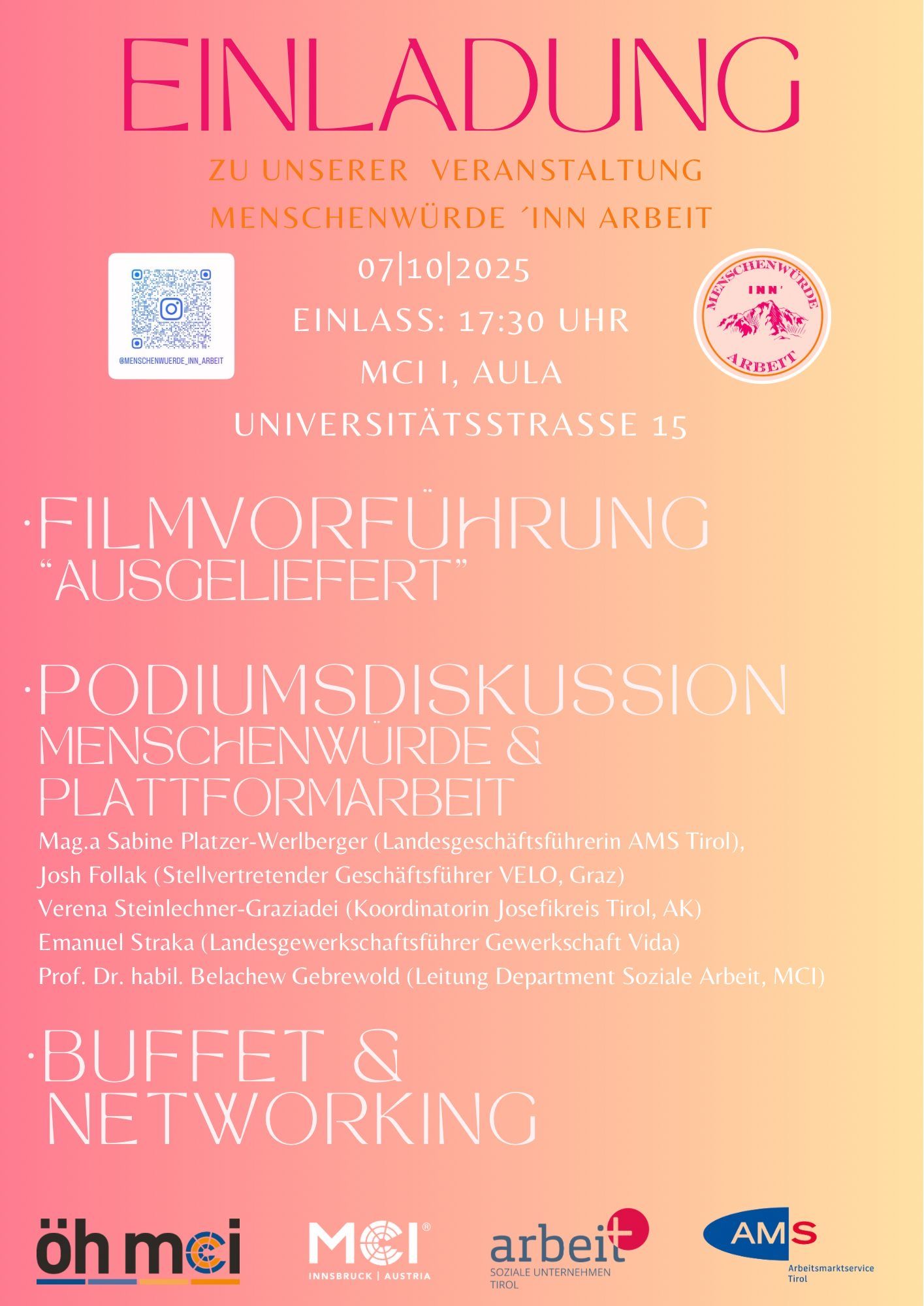 Drei Semester lang haben sich Studierende des MCI Soziale Arbeit gemeinsam mit arbeit plus Tirol-Geschäftsführerin Melanie Spangler und Philipp Bechter intensiv mit dem Thema menschenwürdige Arbeit auseinandergesetzt. Sie führten Interviews mit Passant:innen, besuchten Soziale Unternehmen, entwickelten eine Social Media-Kampagne und machten mit einer Plakataktion auf prekäre Arbeitsbedingungen aufmerksam. Abschluss und Höhepunkt des Projekts ist die Veranstaltung „Menschenwürde INN‘ Arbeit“ am 7. Oktober 2025 um 17:30 Uhr im MCI (Aula, Universitätsstraße 15, 6020 Innsbruck). Eingeladen sind alle Interessierten, Studierende, Lehrende, Vertreter:innen Sozialer Unternehmen, Politik und Verwaltung sowie Partnerorganisationen.